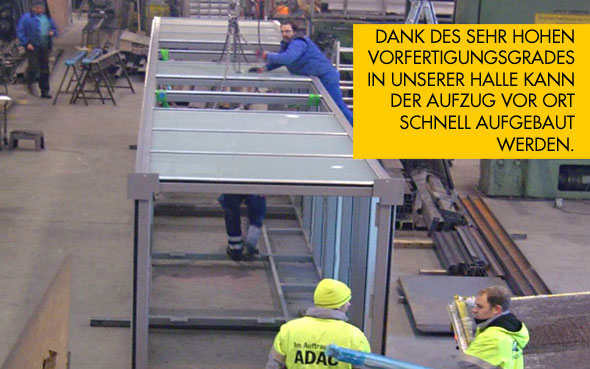 Profitieren Sie vom hohen Vorfertigungsgrad unserer Schachtgerüste! Jeder Aufzugsschacht wird in unserer Halle komplett fertig gebaut. Immer häufiger sogar komplett verglast. Vor Ort ist die Montage dadurch schneller und schmutzärmer.