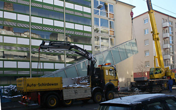 Wenn alle Voraussetzungen passen, bieten wir Ihnen gerne an, das Aufzugsschachtgerüst bereits fix und fertig verglast auf die Baustelle zu bringen. Die Montage vor Ort ist dann wesentlich schneller.